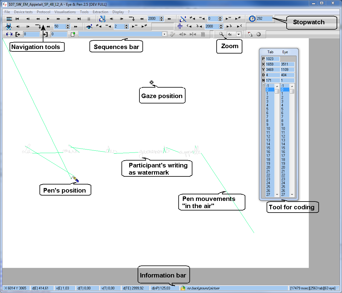 La vidéo ci-dessous montre la lecture simple (en marche avant) d’un enregistrement simultané de la production manuscrite et des mouvements oculaires. La position de l’oeil est symbolisée par un curseur en forme de croix, tandis que la position du crayon est symbolisée par … un petit crayon. Lorsque le crayon quitte la tablette (pause « crayon levé »), un trait est dessiné, reliant cette position avec le lieu où le crayon sera reposé sur la tablette. A des fins d’aide, la production finale est affichée sous forme de filigrane de couleur bleue. On peut ainsi voir à l’avance ce qui sera écrit.